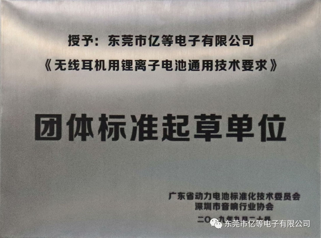 東莞(wǎn)市億等電子有限公司有幸受(shòu)邀參與“首部無線耳機用鋰離子電池通用技術(shù)要求團體標準起草單位”授牌典禮,並被授予:《無線耳機用鋰離子電池通(tōng)用技術要求》標準起草單位。